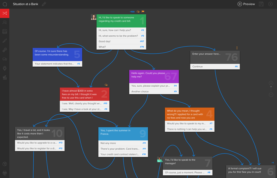 Authoring simulations is easy when you use a tool that was created specifically for this task. Create branching scenarios in a visual editor that runs in your browser on any computer. No need to be a graphic designer or a professional developer – simply type the content and connect decision points. Our scenario tool basically does the rest.